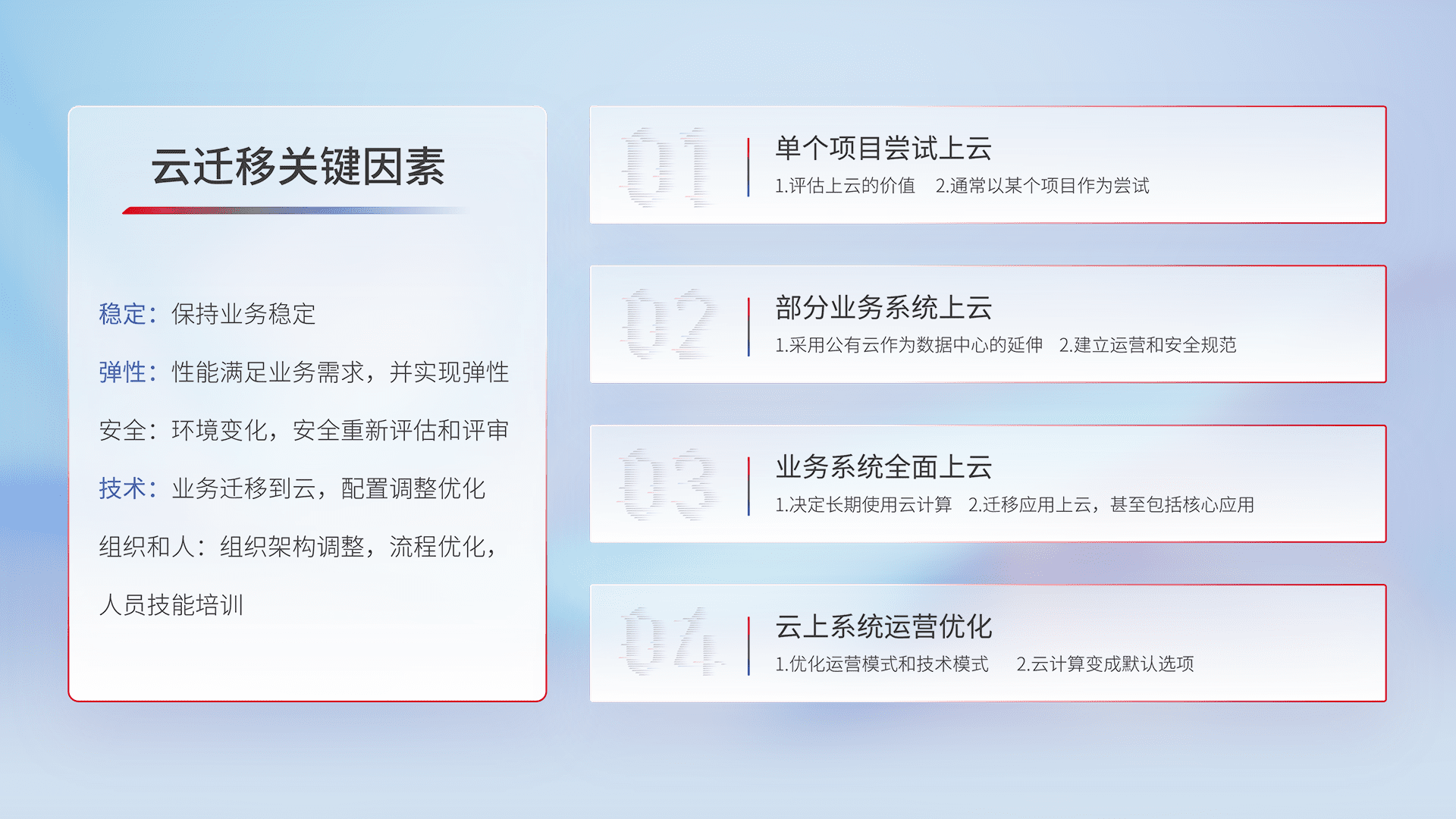 结合实际业务,,,从规划设计、、云平台选型、、云原生改造、、数据迁移、、、、集成交付,,迁移全过程为客户识别最佳上云路径,,,做好风险识别管理,,,,设计网络架构、、、身份权限、、、安全审计合规、、操作审计、、、、日志审计、、、、监控告警策略、、多站点容灾设计等,,对云上基础设施进行整体规划,,,提升IT治理水平,,,,以满足弹性、、、、高可用、、、、高性能的需求。。。。