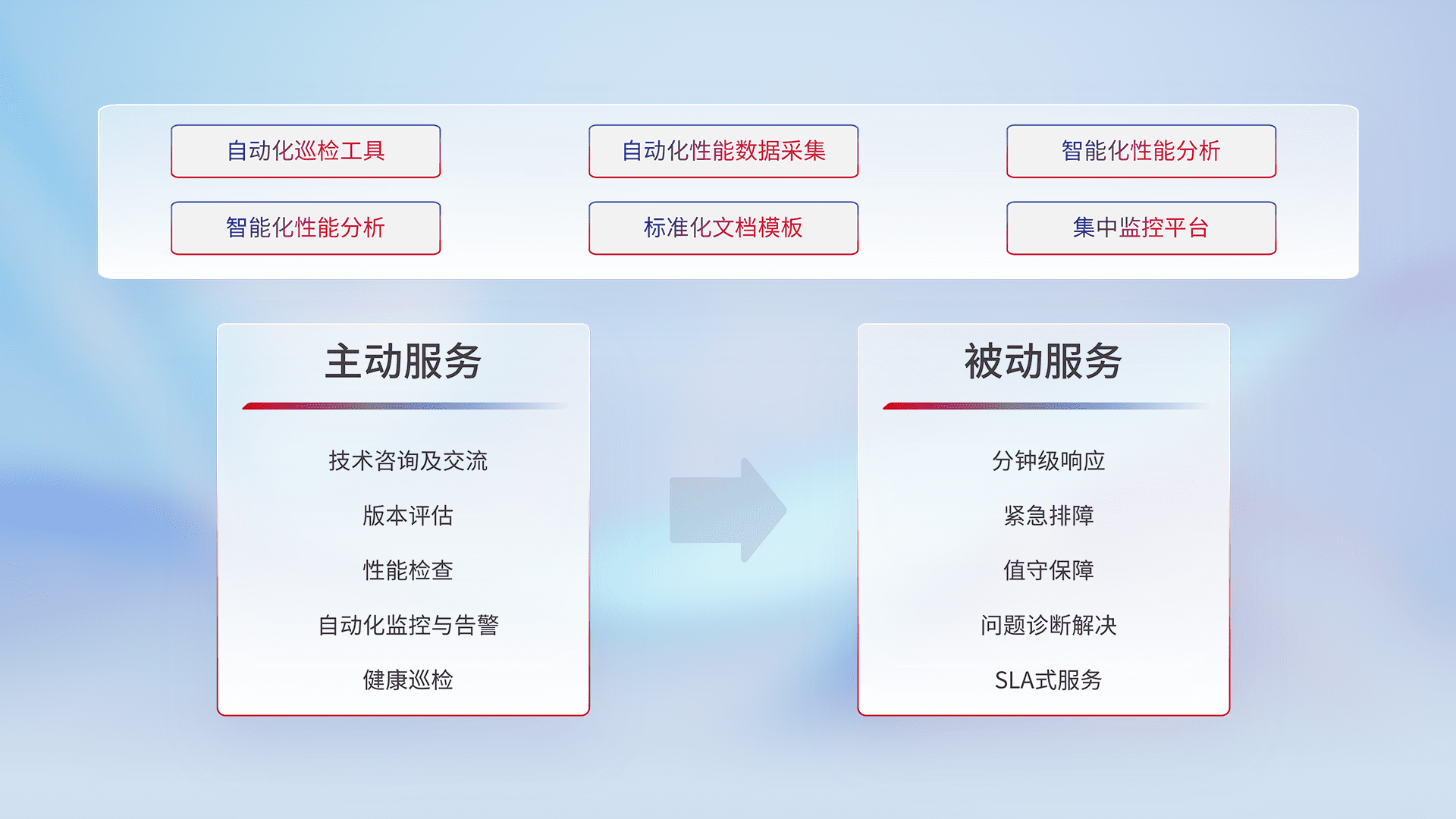 智能化工具和标准化文档,,,,保障服务质量,,,,提供主动服务(包含技术咨询、、、版本评估、、、性能检查、、自动化监控与告警、、健康巡检)和被动服务包含(分钟级响应、、、紧急排障、、、值守保障、、、、问题诊断解决、、、SLA服务)。。。。